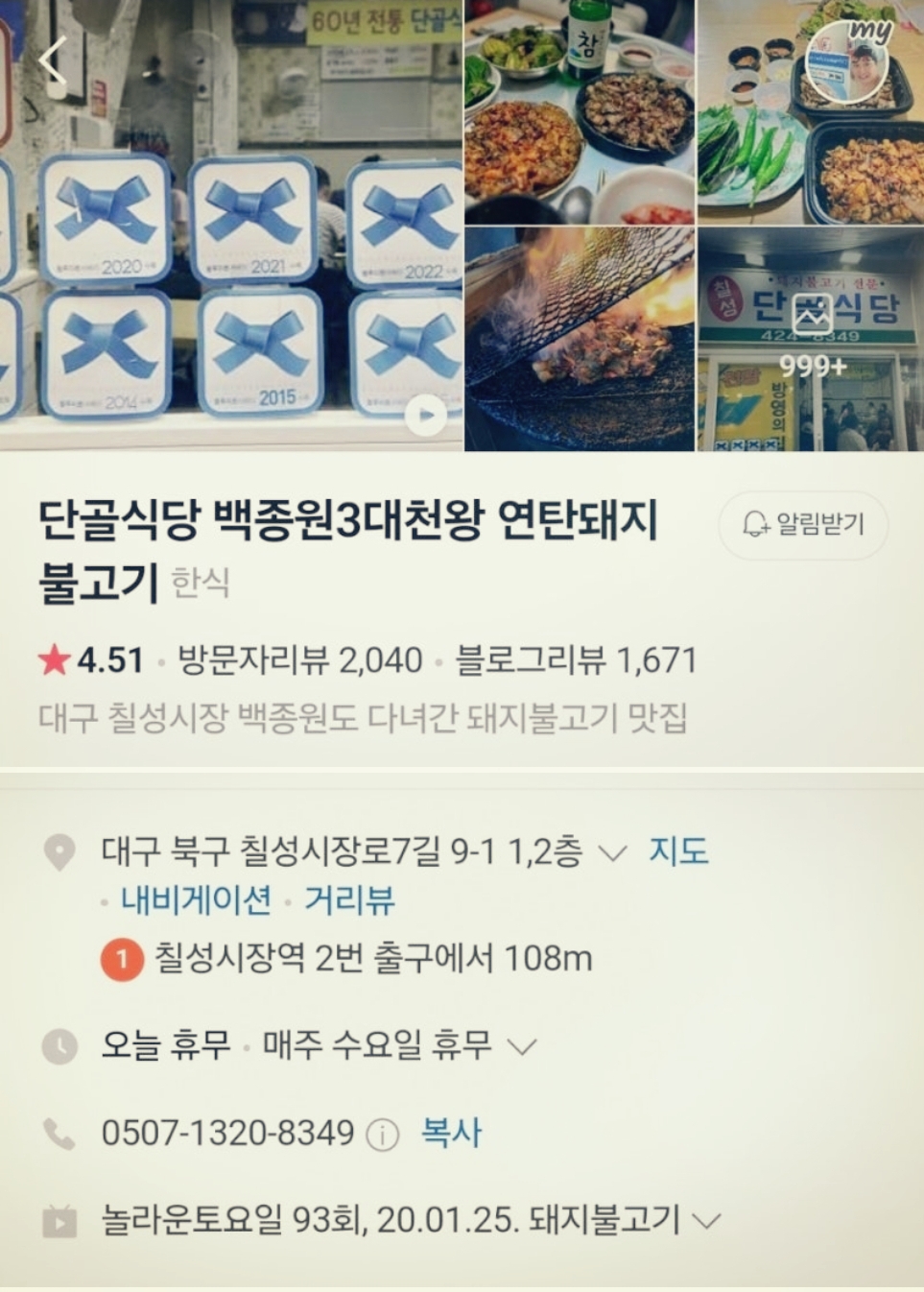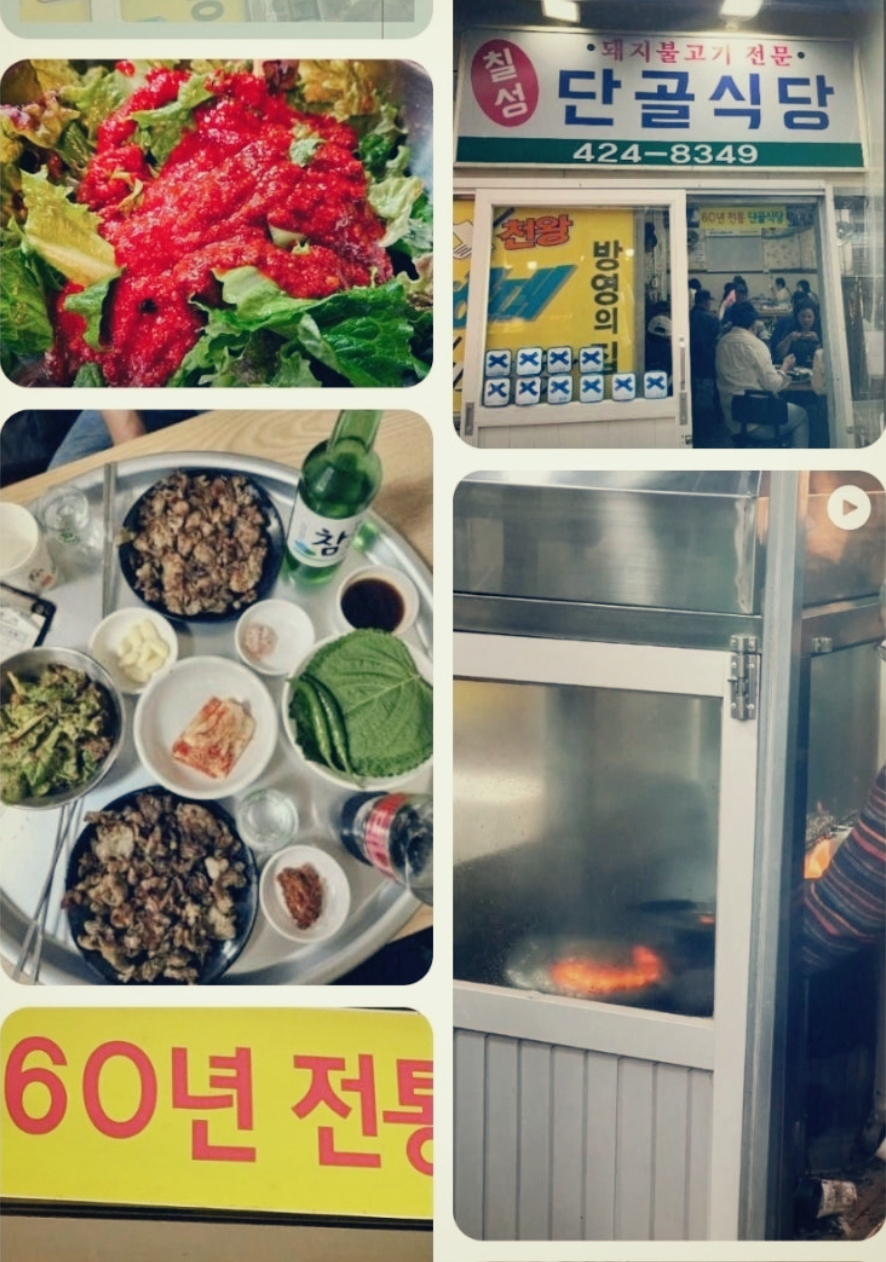 처음으로 소개할 식당은 바로 단골식당으로써 칠성시장에 위해있습니다. 백종원도 다녀간 연탄불고기로 소문난 식당이죠. 연탄불에 초벌 해서 불향이 진하고 고기도 부드럽고 양념맛도 일품이라고 합니다. 많은 분들이 찾는 식다라고 합니다.
